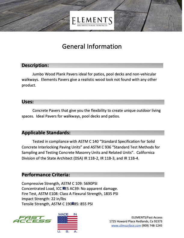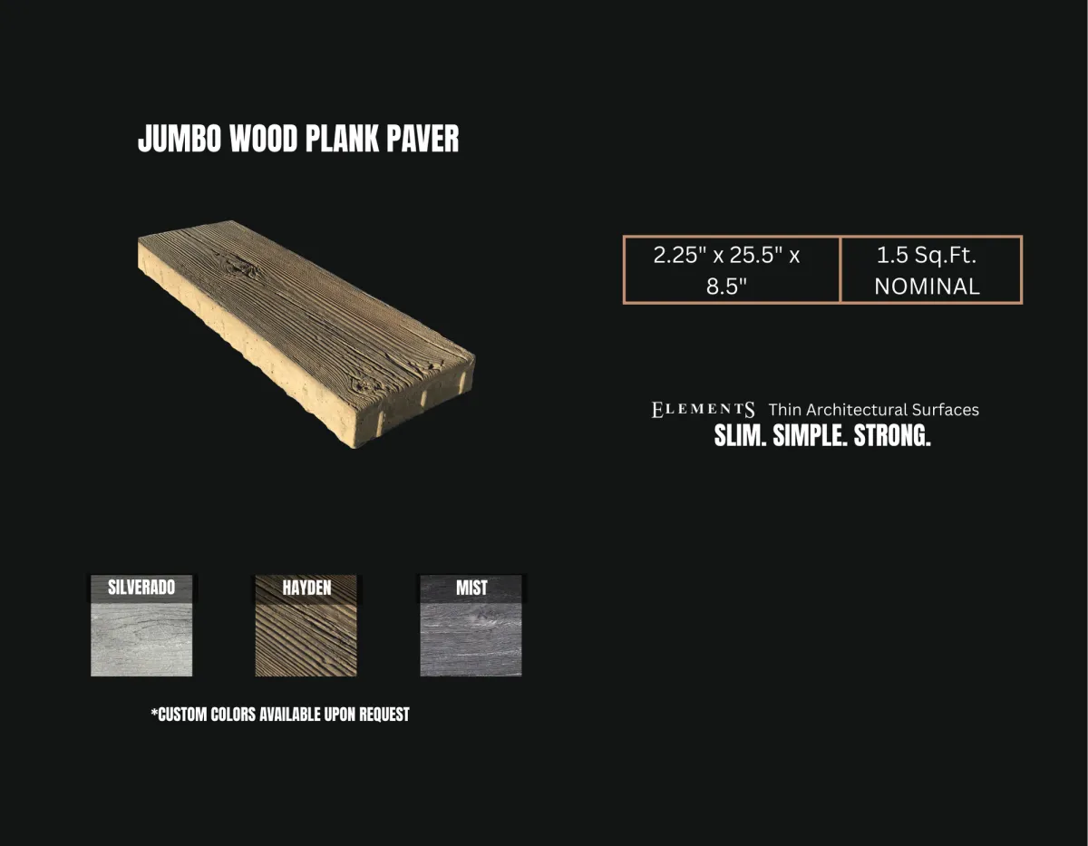 Jumbo Wood Plank Pavers deliver a bold, wood-inspired aesthetic with the strength and durability of engineered concrete. Each oversized plank is crafted using our proprietary concrete blend and integral color system, giving you a realistic wood finish that outperforms traditional materials. With a surface area of approximately 1.50 sq ft per piece, these pavers provide the flexibility to create visually striking patios, walkways, and pool decks with ease.